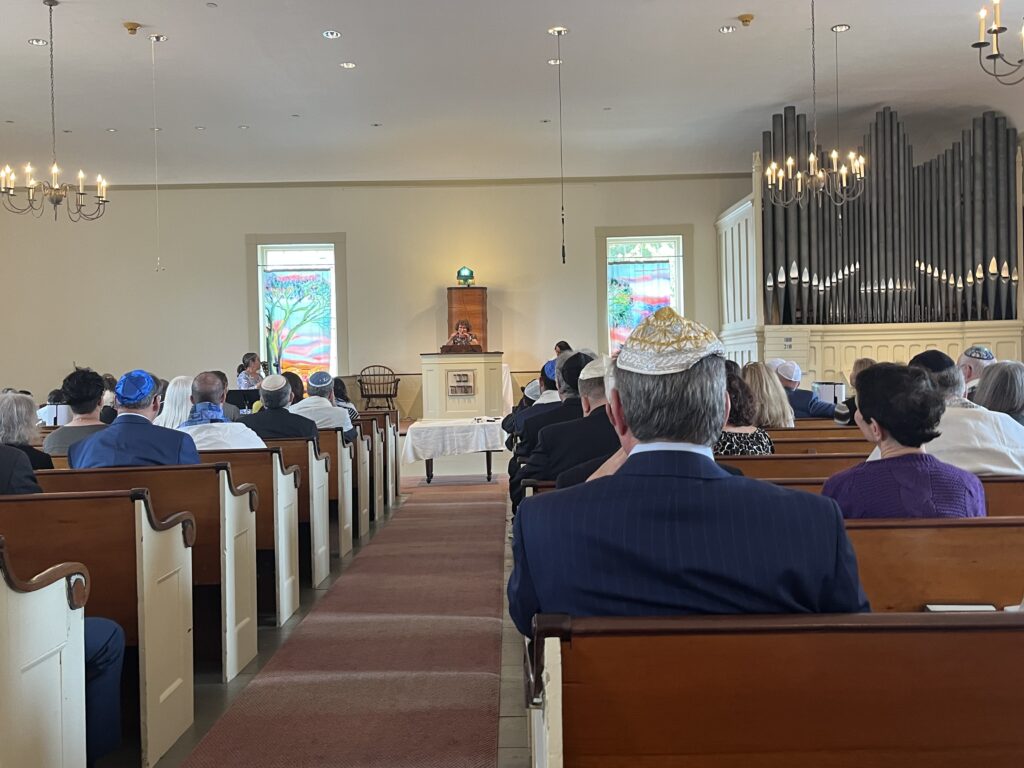 I want to offer my thanks to the members of First Parish of Sudbury for sharing their beautiful sanctuary with us and giving us a sacred place to hold our High Holiday services this year. And I want to give a special shout-out and thank you to Terry Lockhart, who is sitting in the back of the sanctuary. Terry is the sound engineer for First Parish. He is providing all of the technical support to create the beautiful sound of our services and allowing people who could not be here in person to join us via Zoom. Thank you so much for all of your help.